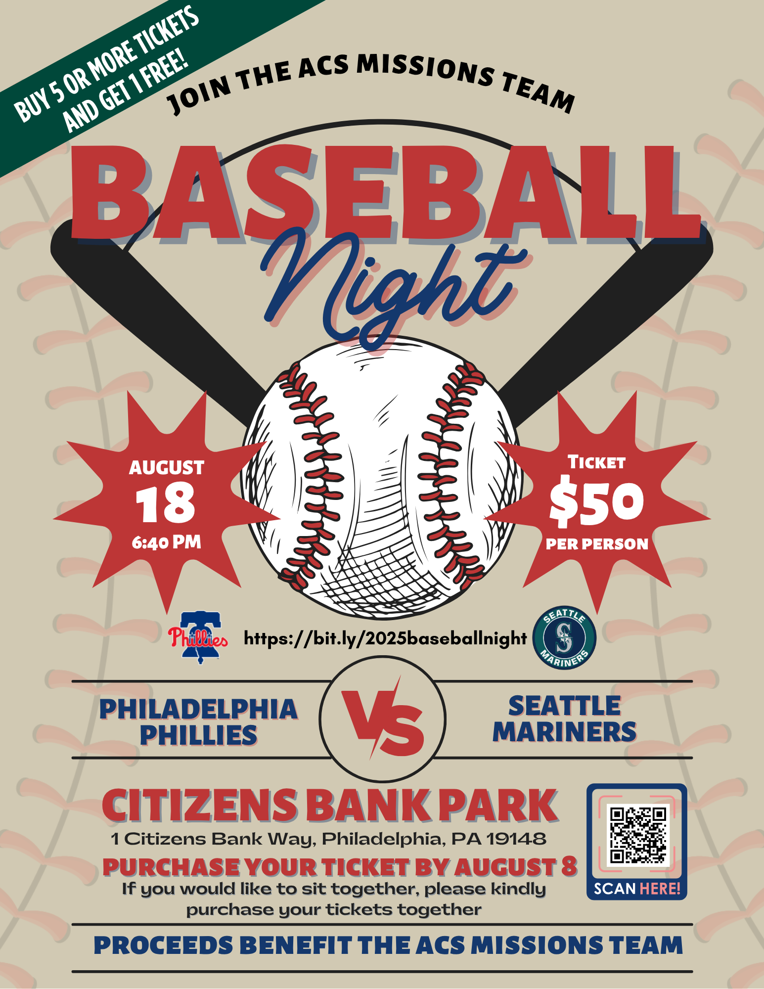Join the ACS Missions Team for Baseball Night at the Philadelphia Phillies vs. Seattle Mariners game on Monday, August 18, at Citizens Bank Park. The game starts at 6:40 PM. Please purchase your tickets by August 8 at https://bit.ly/2025baseballnight. Buy 5 tickets or more and get 1 ticket for free! A limited number of tickets are available, so please purchase early. Proceeds benefit the ACS Missions Team. Order early to get the best seats—closer to the front of our group section!