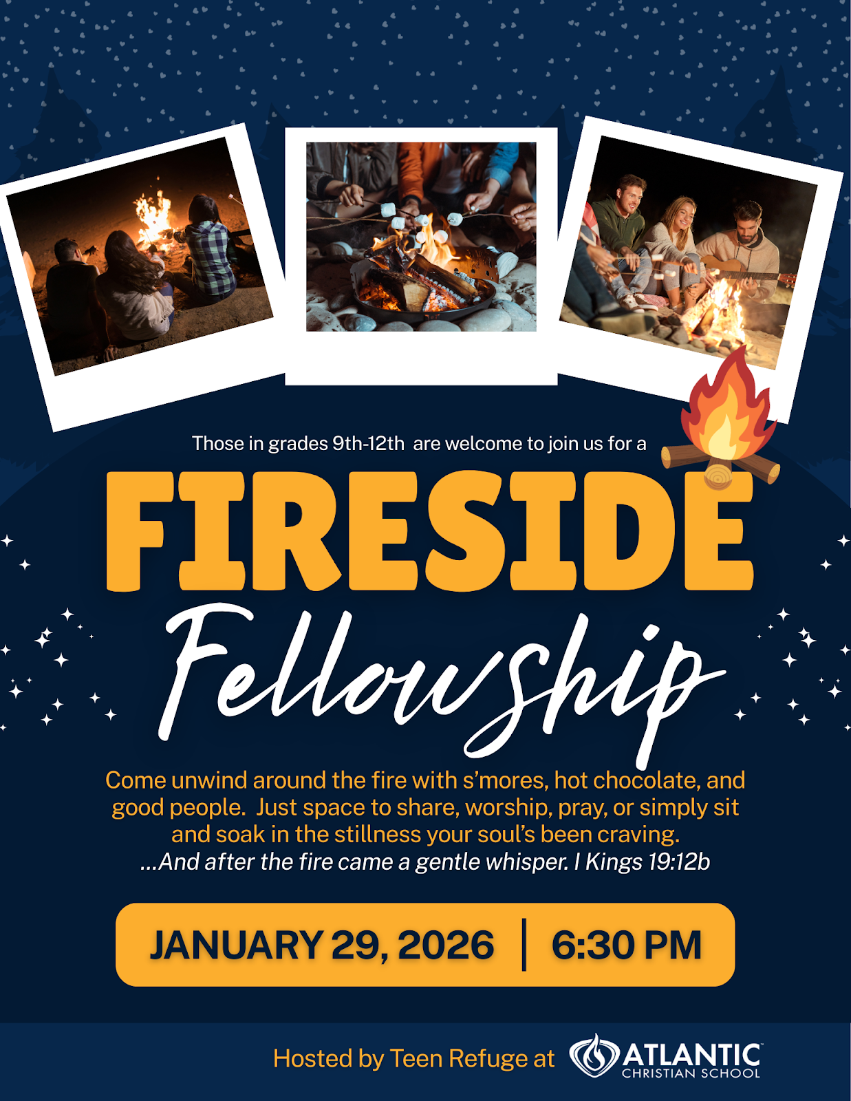 High school students are invited to join us for Fireside Fellowship on Thursday, January 29 at 6:30 p.m. This evening will be a special time of fellowship, worship, and prayer.