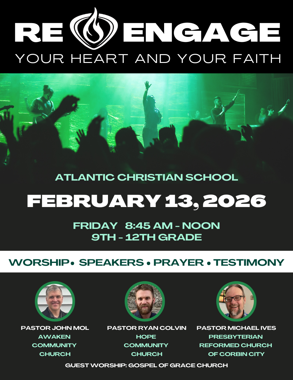 On Friday, February 13, Atlantic Christian School students in grades 9–12 will participate in the Re-Engage High School Spiritual Emphasis Day, a day focused on spiritual growth and worship.