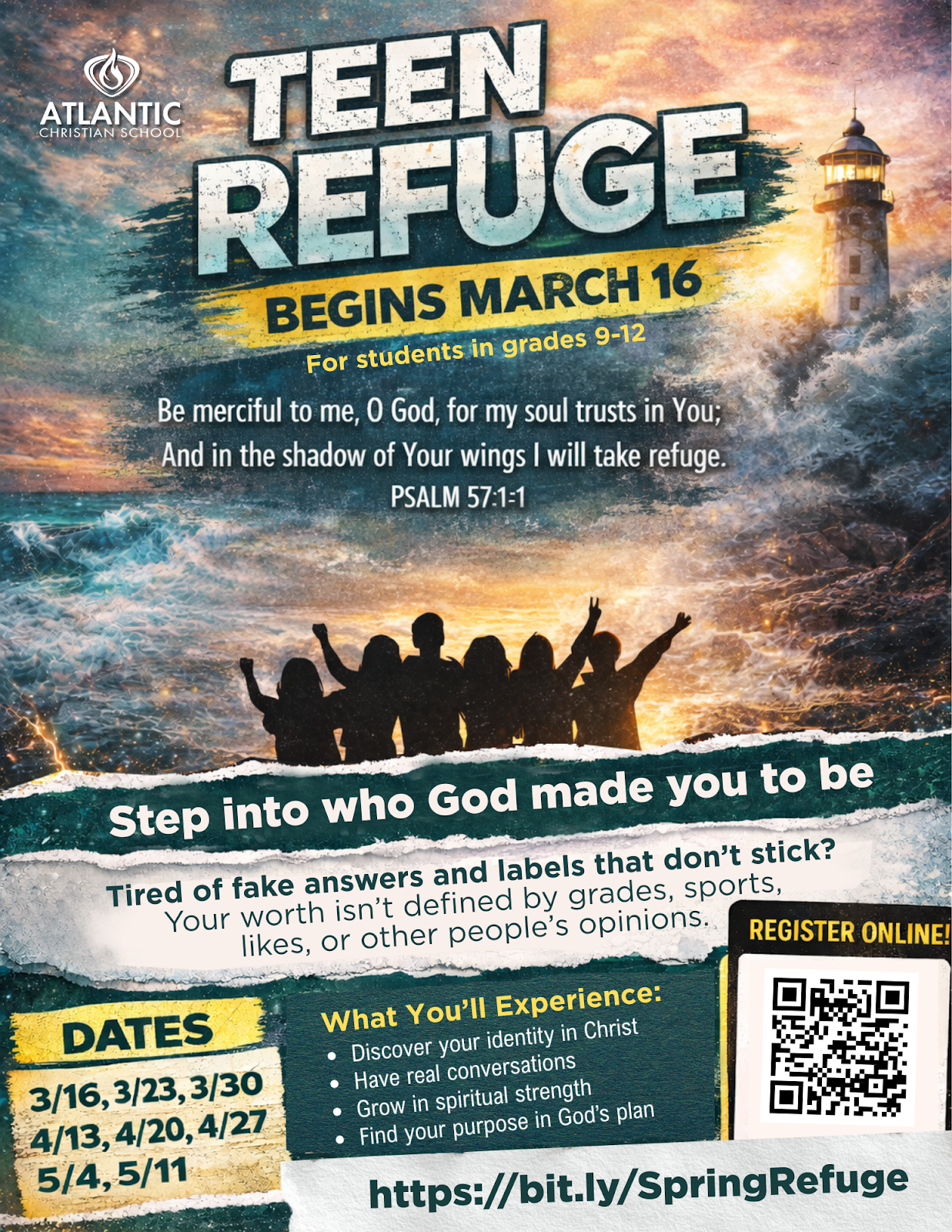 During Teen Refuge, students will explore Scripture in a meaningful way through engaging lessons, discussion, and activities. They will look at how people in the Bible faced fear, rejection, and opposition, and how those same truths can guide teens today. Students will also discover practical ways to walk through life with faith, courage, and resilience.