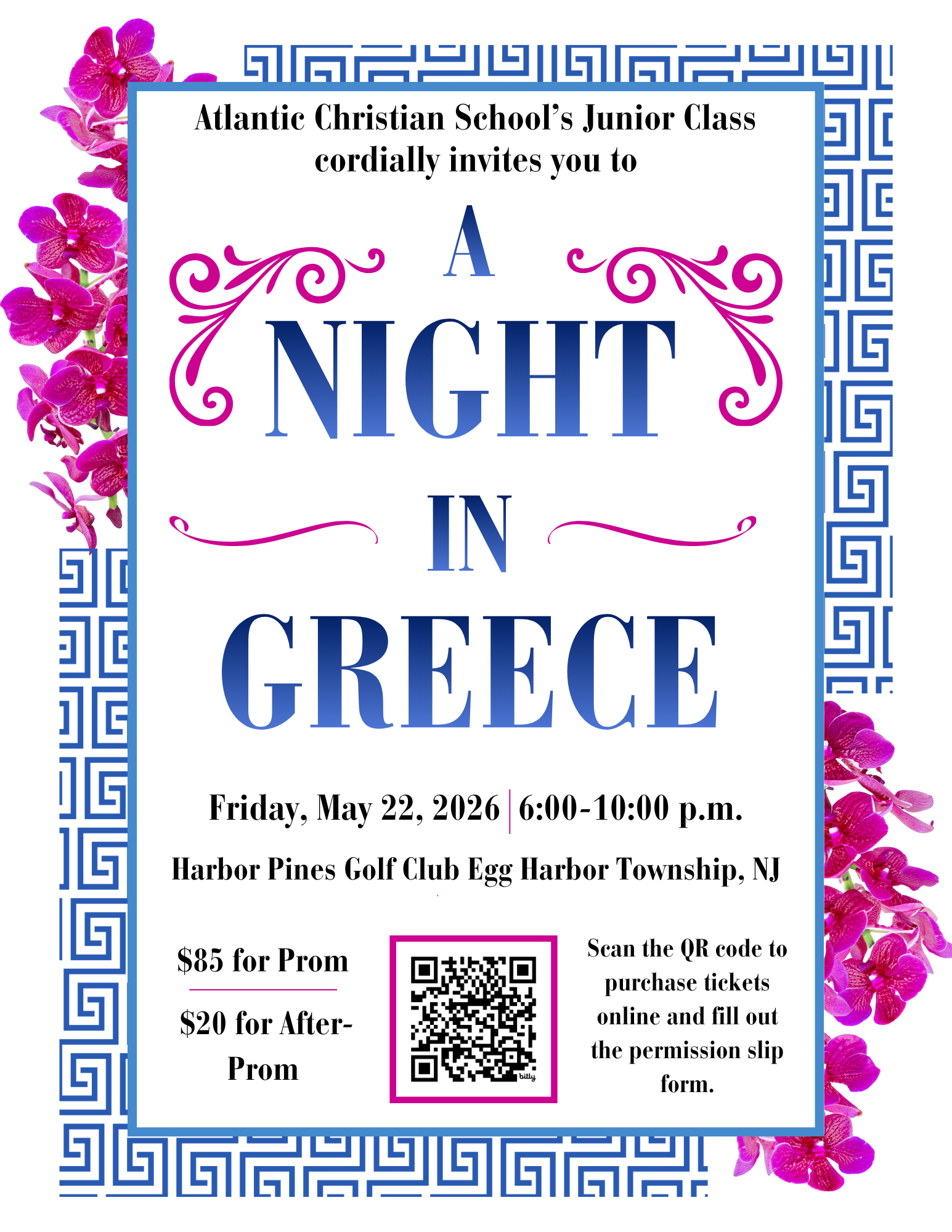 Atlantic Christian School’s Junior Class invites high school students to Prom on Friday, May 22, 2026, from 6:00–10:00 PM at Harbor Pines Golf Club. This year’s theme, A Night in Greece, will provide an elegant and memorable evening.