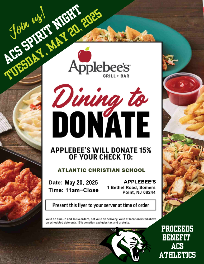 Make plans to dine out with family and friends at Applebee’s in Somers Point on Tuesday, May 20 for ACS Spirit Night! When you eat at Applebee’s that evening, 15% of your total check will be donated to support our Athletic Program.