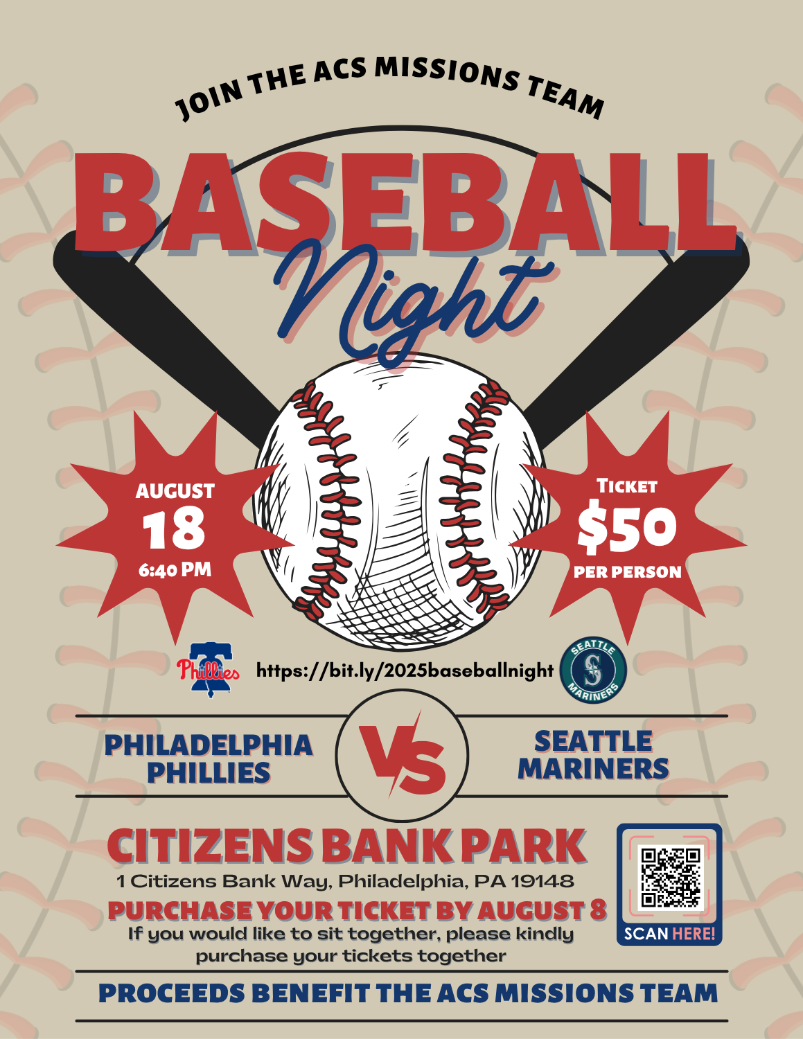 Join the ACS Missions Team for Baseball Night at the Philadelphia Phillies vs. Seattle Mariners game on Monday, August 18, at Citizens Bank Park. The game starts at 6:40 PM. Please purchase your tickets by August 8 at https://bit.ly/2025baseballnight. A limited number of tickets are available, so please purchase early. Proceeds benefit the ACS Missions Team.