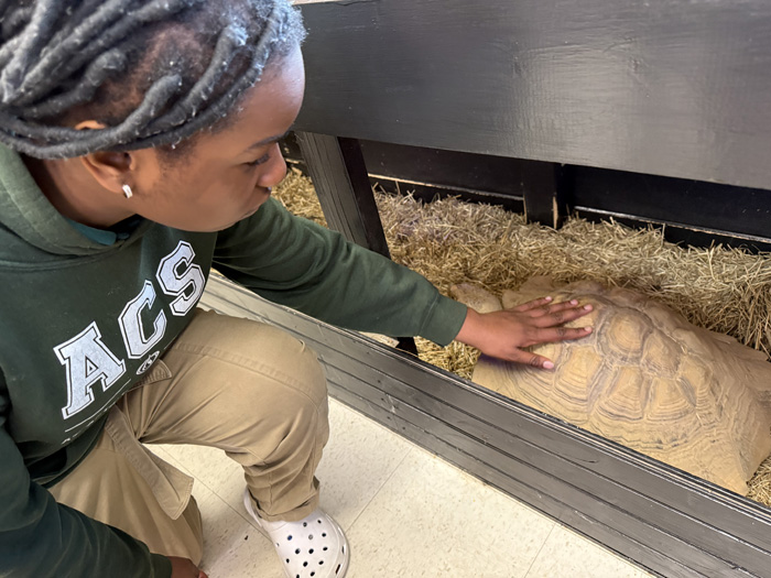 On Friday, May 9 we said goodbye to a member of the ACS family and Mr. Genter’s zoo. Tortilla, Mr. Genter’s 16 year old African Spurred Tortoise, has been at ACS for 10 years in the Life Sciences room upstairs. However, Tortilla is young so needed a better home to roam and grow for years and years (up to 150) to come. Mr. Genter delivered her to a Tortoise Farm where she will live with over tortoises and have the space that she needs to thrive.