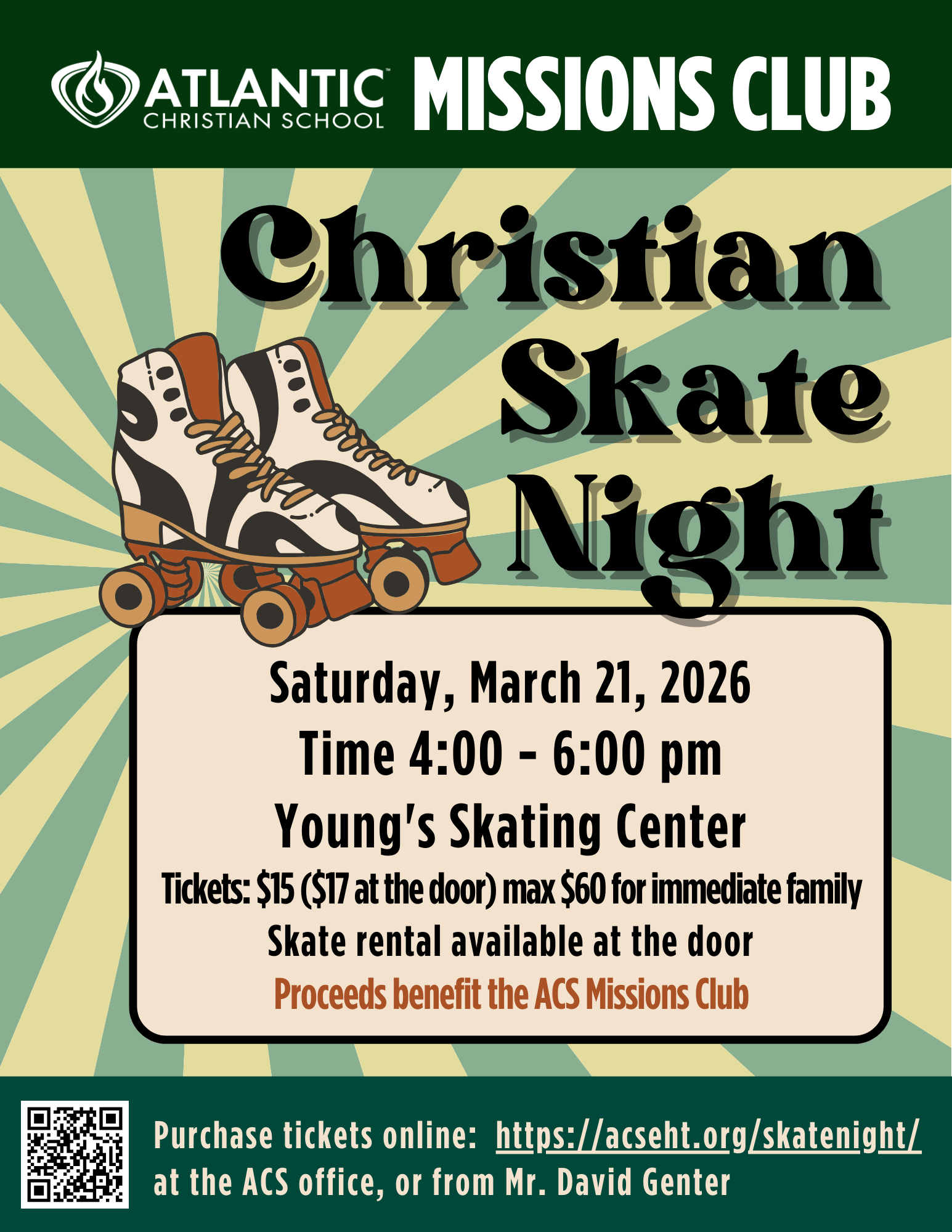 Admission is $15 per person ($17 at the door), with a maximum of $60 per immediate family. Skate rentals will be available at the door. Proceeds from the event will benefit the ACS Missions Club.Purchase tickets online at:https://acseht.org/skatenight/