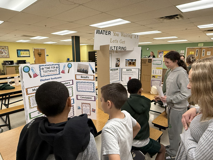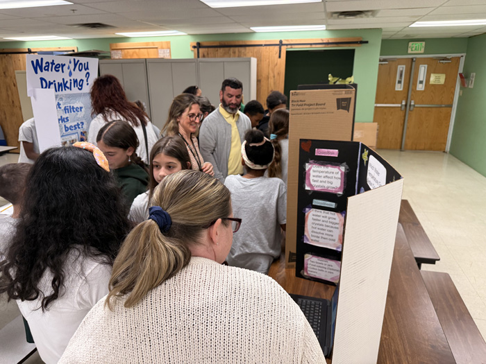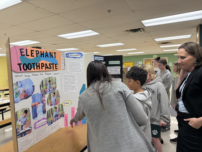 Each student proudly stood by their display board, ready to explain their hypothesis, process, and conclusion. The fair was set up in rotating sessions, giving students from all three 5th grade classes time to present their projects and interact with classmates and visiting adults.